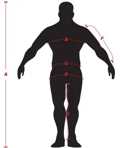 Size (USA)EUROHEIGHTWEIGHT (LBS)CHEST (IN.)WAIST (IN.)HIPS (IN.)INSEAM (IN.)SLEEVE (IN.)