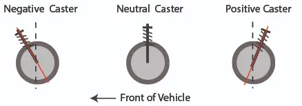 To understand CASTER, picture an imaginary line that runs from the upper to the lower ball joint with caster being the forward or backward tilting of the imaginary line. If, for example, the imaginary line tilts toward the back of the car at the upper ball joint, a positive caster condition would exist. On the other hand, if the imaginary line tilts toward the front of the car, it would cause negative caster. While most cars feature a small amount of positive caster to provide directional stability, too much positive caster can actually cause steering effort to become difficult. Negative caster, on the other hand, provides eased steering but can allow the car to wander.